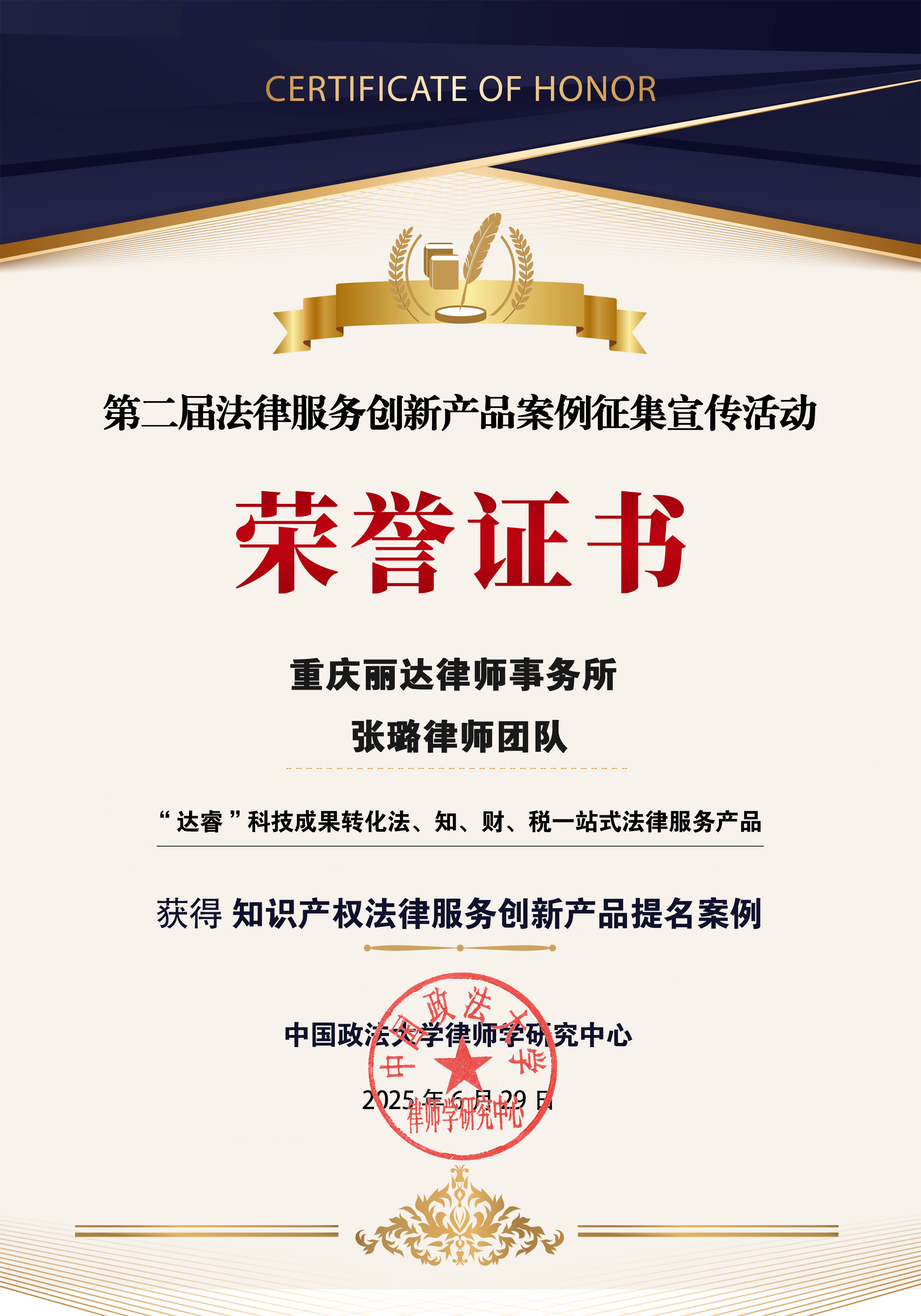 张璐律师团队联合重庆大学、重庆工商大学,共同研发的 “达睿” 科技成果转化法、知、财、税一站式法律服务产品,斩获知识产权法律服务创新产品 “提名案例”奖。该产品积极响应国家加快实施创新驱动发展战略,针对高校科技成果转化实践中存在难点、堵点问题,以法、知、财、税全周期、跨领域、一站式服务打破传统单一模式,通过知识产权确权、法律风险防控、财税策略优化的三维整合,为高校、科研机构打通从成果申报到收益分配的价值转化通道。未来,丽达所将持续深耕高校科技成果转化,不断拓展科研机构、高科技企业,为其提供更具前瞻性、个性化和实用性的科技成果转化法律服务。该产品彰显了法律服务在科技成果产业化进程中激活创新价值、优化资源配置的核心效能,为行业探索高质量法律服务供给提供了可复制的标杆范式。